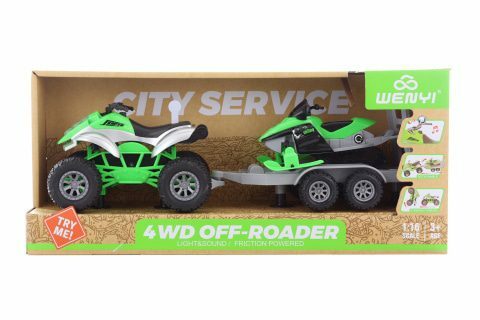 Plastová čtyřkolka s vlekem a skútrem. Čtyřkolka vydává zvuky a svítí. Napájení na 3 AG13 baterie (jsou součástí balení). Rozměry balení cca 42 x 18,5 x 11,5 cm. Věk 3+