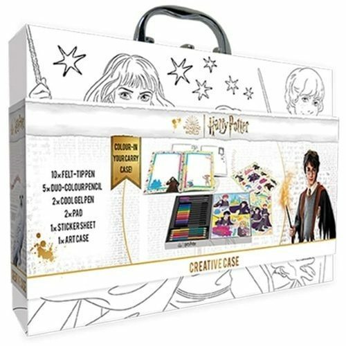 Kreativní kufřík obsahuje černobíle potištěný kufřík k vybarvení, 10 barevných fixů, 5 dvoubarevných pastelek, 2 gelové fixy, 2 gelová pera, sešit ke kreslení a list samolepek.