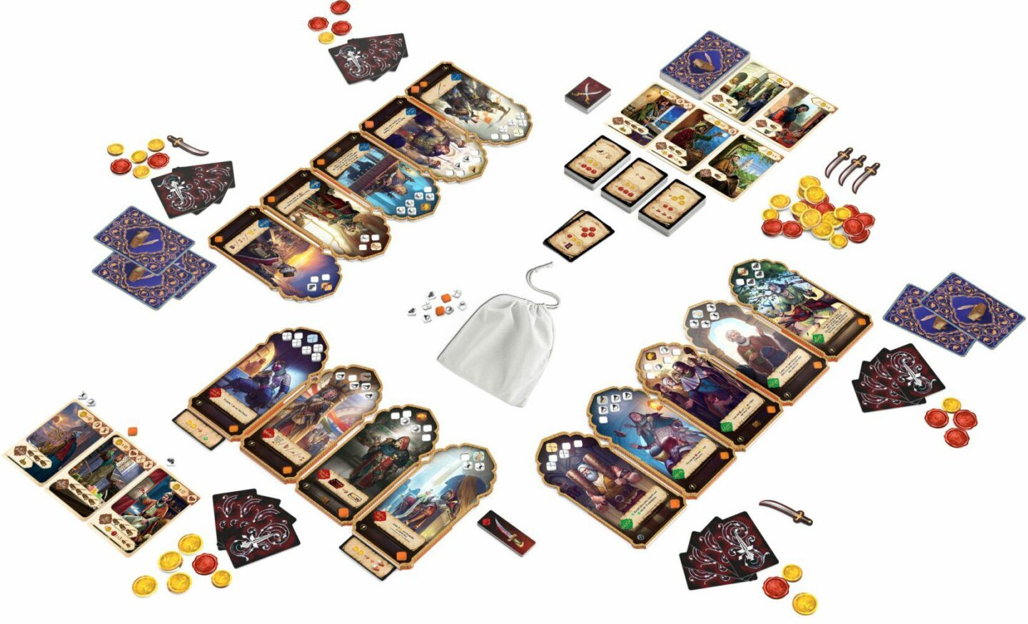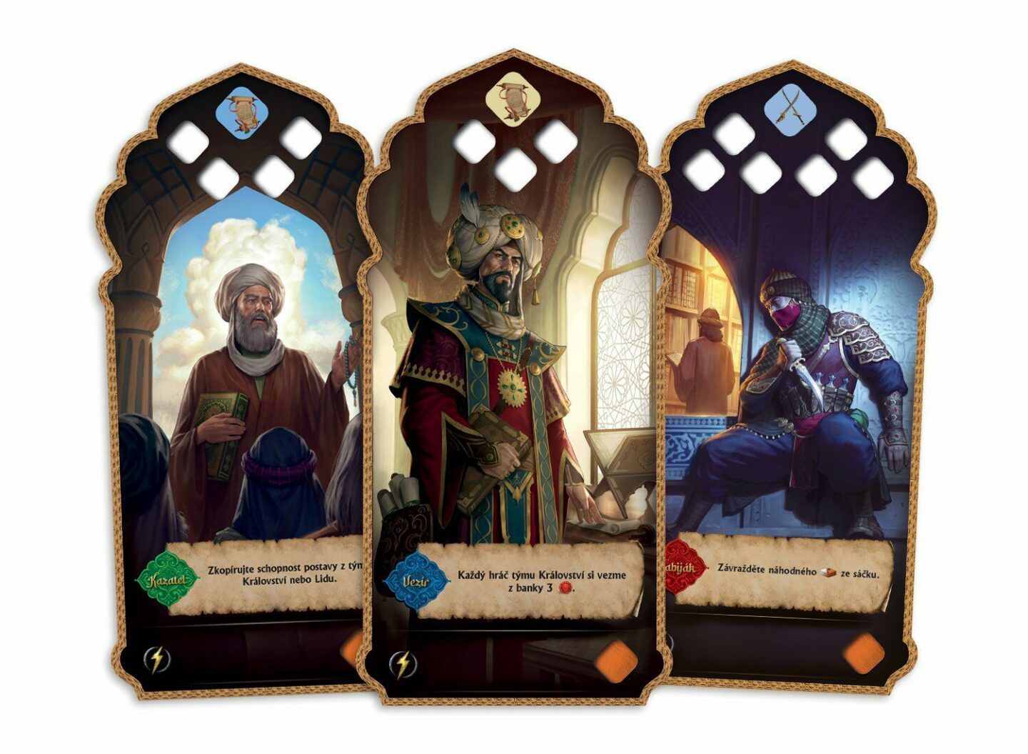shromažďovat síly a bojovat. Obsah balení: 14 karet postav 30 karet učenců, 24 karet boje 70 žetonů spojenců 5 mečů 50 zlaťáků a pečetí 14 karet hašašínů 1 pravidla hry 1 přehled učenců 7 referenčních karet 1 sáček