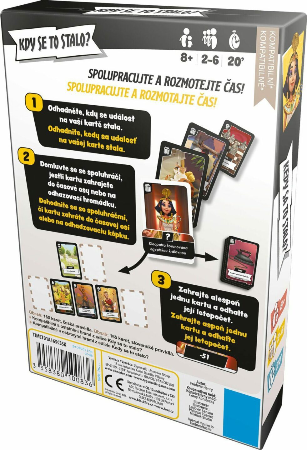 patří. Pokud kartu umístí správně, zbaví se jí. Pokud kartu umístí špatně, odstraní ji ze hry, ale musí si místo ní dobrat novou. Obsah balení: 165 karet česká a slovenská pravidla