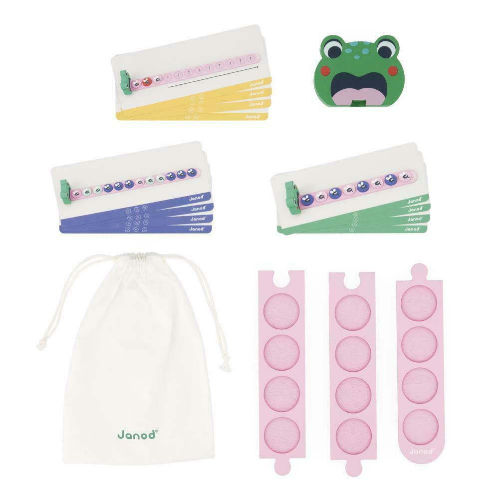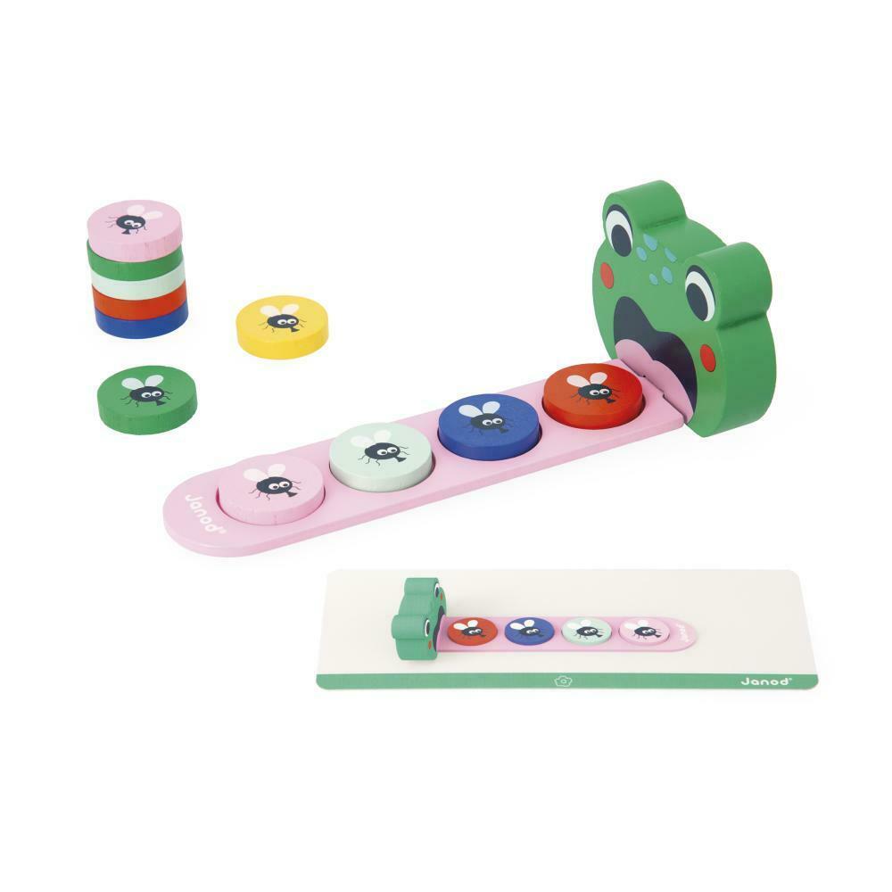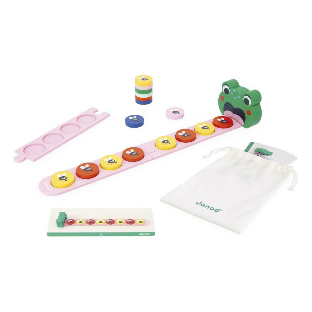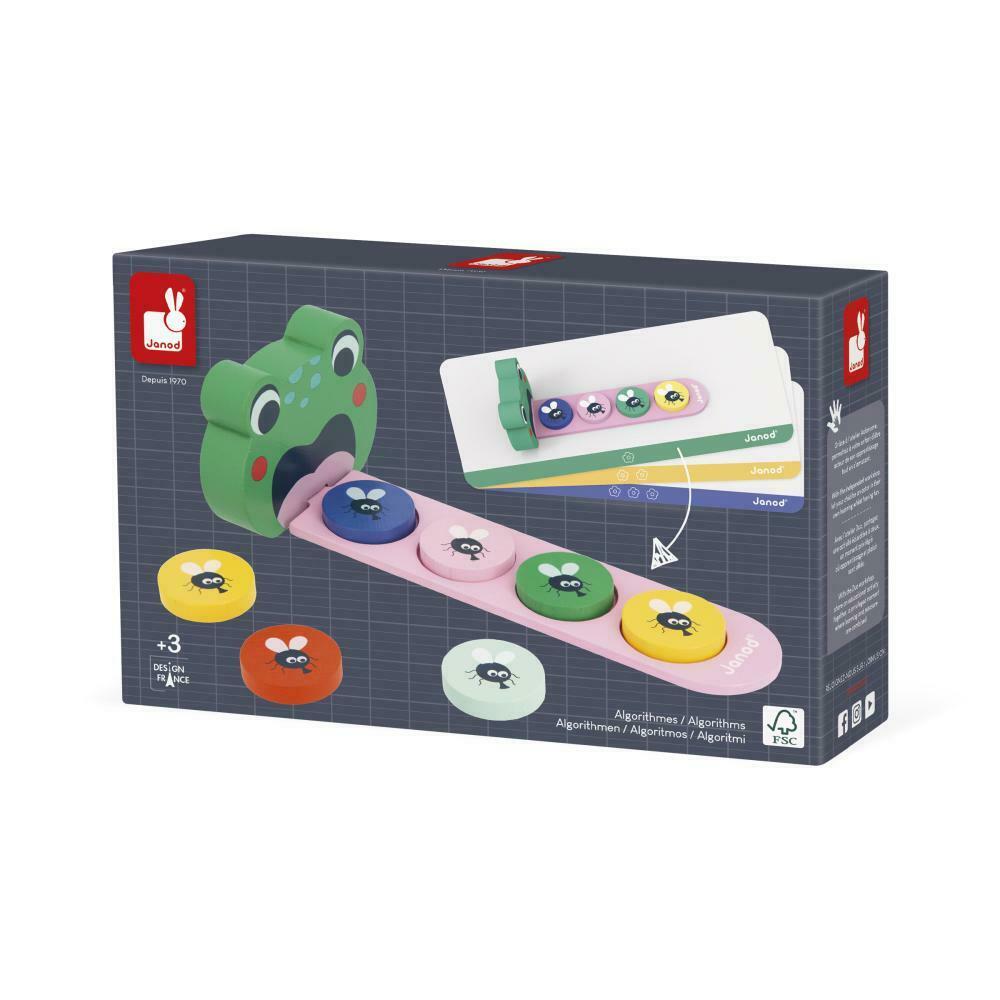 spolupráce s rodičem: pomáhá vašemu dítěti učit se o algoritmech a zároveň sdílet zábavné chvíle. Tato hra se skládá z dřevěné žáby, jazyka rozděleného na 3 do sebe zapadající části, 36 much na barevných žetonech a 12 předlohových karet. Umisťováním much na jazyk