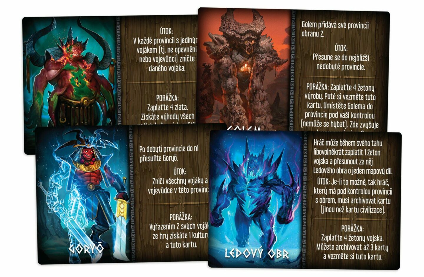 vyhrává hráč, který získal nejvíce vítězných bodů. OBSAH BALENÍ: 105 karet civilizace 54 karet rozvoje 30 karet základních budov 20 karet Automy 24 karet hrdinů a nestvůr 40 mapových dílů terénu 70 žetonů jednotek, zvědů a opevnění 226 dalších žetonů 44 barevných