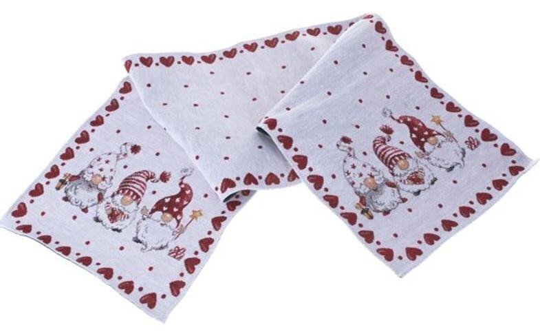 Elegantní běhoun na stůl s veselými skřítky krásně ozdobí vaši domácnost. 33 x 140 cm Prát při 30°Může se žehlit. Nesmí se su...