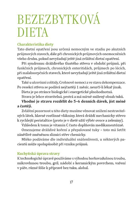 Dietní kuchařka je určená nemocným po akutních průjmových stavech a při chronických průjmových onemocněních, pokud nevyžadují ještě jiná zvláštní dietní opatření, při syndromu dráždivého tlustého střeva v období průjmů, u ulcerosní kolitidy a Crohnovy nemoci, po resekci střev a z počátku...