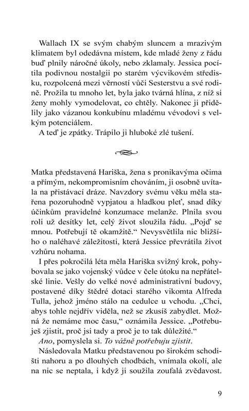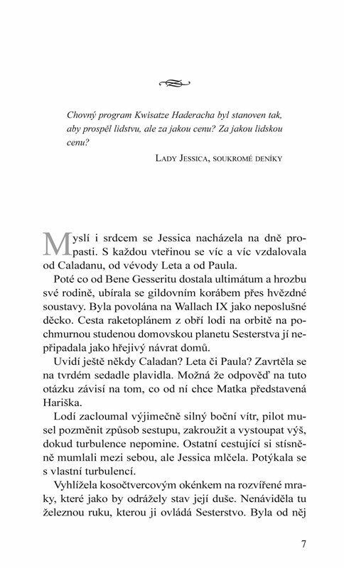 Lady Jessica, matka mladého Paula a konkubína vévody Leta, byla až donedávna pilířem rodiny Atreidů. Volba, jíž se před lety dopustila, se brzy podepíše na vývoji celého Impéria, prozatím se však lady z Caladanu musí vypořádat se svým vztahem k Bene Gesseritu. Už jednou se k němu obrátila zády a...