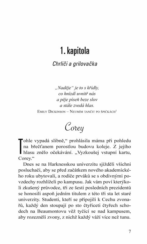 Corey Callahanová předpokládala, že na Harknesskou univerzitu nastoupí jako členka univerzitního hokejového týmu. Po vážné nehodě jí však nezbývá než se pustit do studia v invalidním vozíku.Naproti přes chodbu v bezbariérové koleji bydlí Adam Hartley, další, kdo se měl původně stát univerzitní...