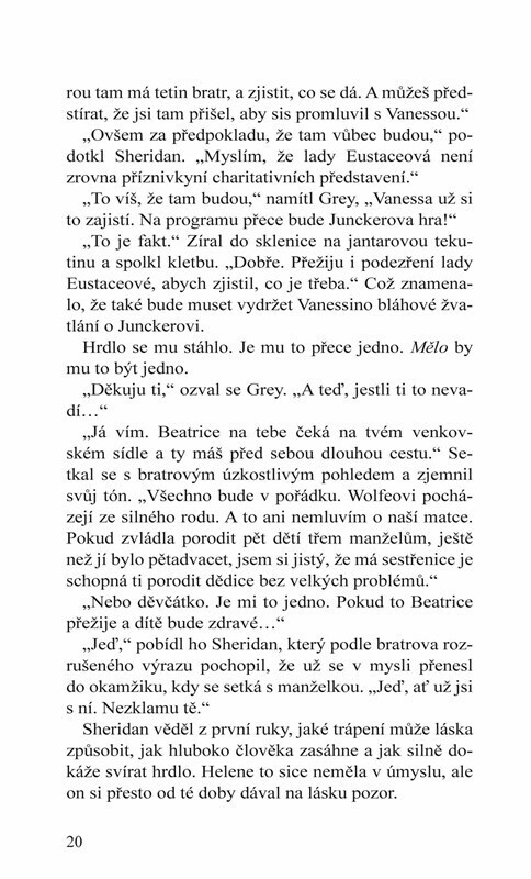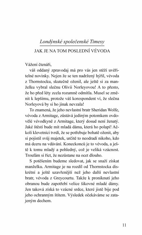 Sheridan Wolfe, starší syn z třetího manželství vévodkyně z Armitage, se po nenadálé otcově smrti stává nečekaně vévodou z Armitage, přestože se po celý život připravoval na dráhu diplomata. A nejen že se hned po počátku své vévdoské éry potýká s finančními problémy, ještě ke všemu inicioval...