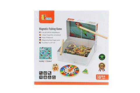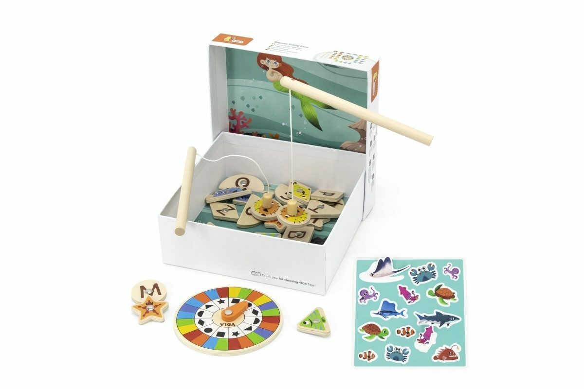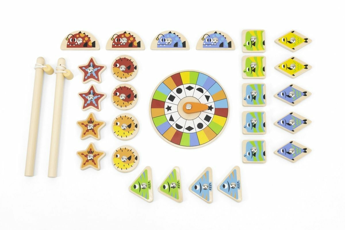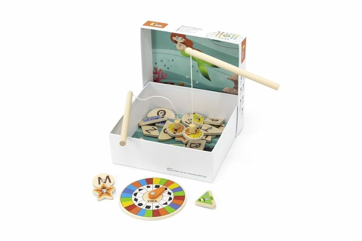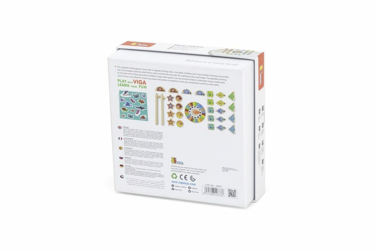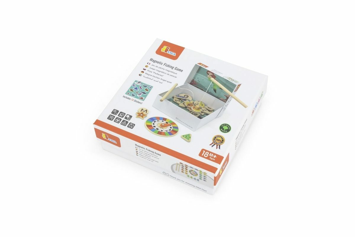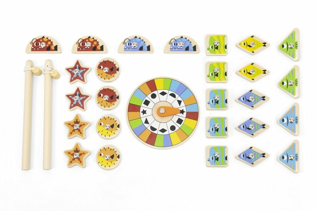 Dřevěná hra magnetické rybaření. Sada obsahuje 2 pruty, 26 rybiček a 14 samolepek. Rozměry balení cca 21x21x7 cm. Věk 18m+