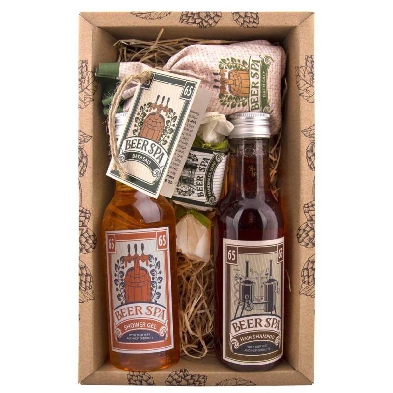 Dárkové balení pivní kosmetiky Beer Spa – sprchový gel 200 ml, koupelová pěna 200 ml, mýdlo 30 g a koupelová sůl 150 g. Originál...