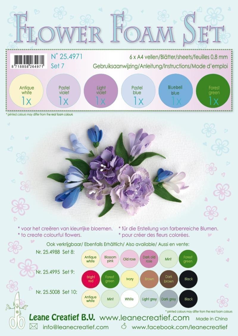 sada speciálních pěnovek na výrobu květin, formát A4 (21x29,7cm), tloušťka 0,8mm, 6 barev. Měkká pěnová guma s porézní strukturo...