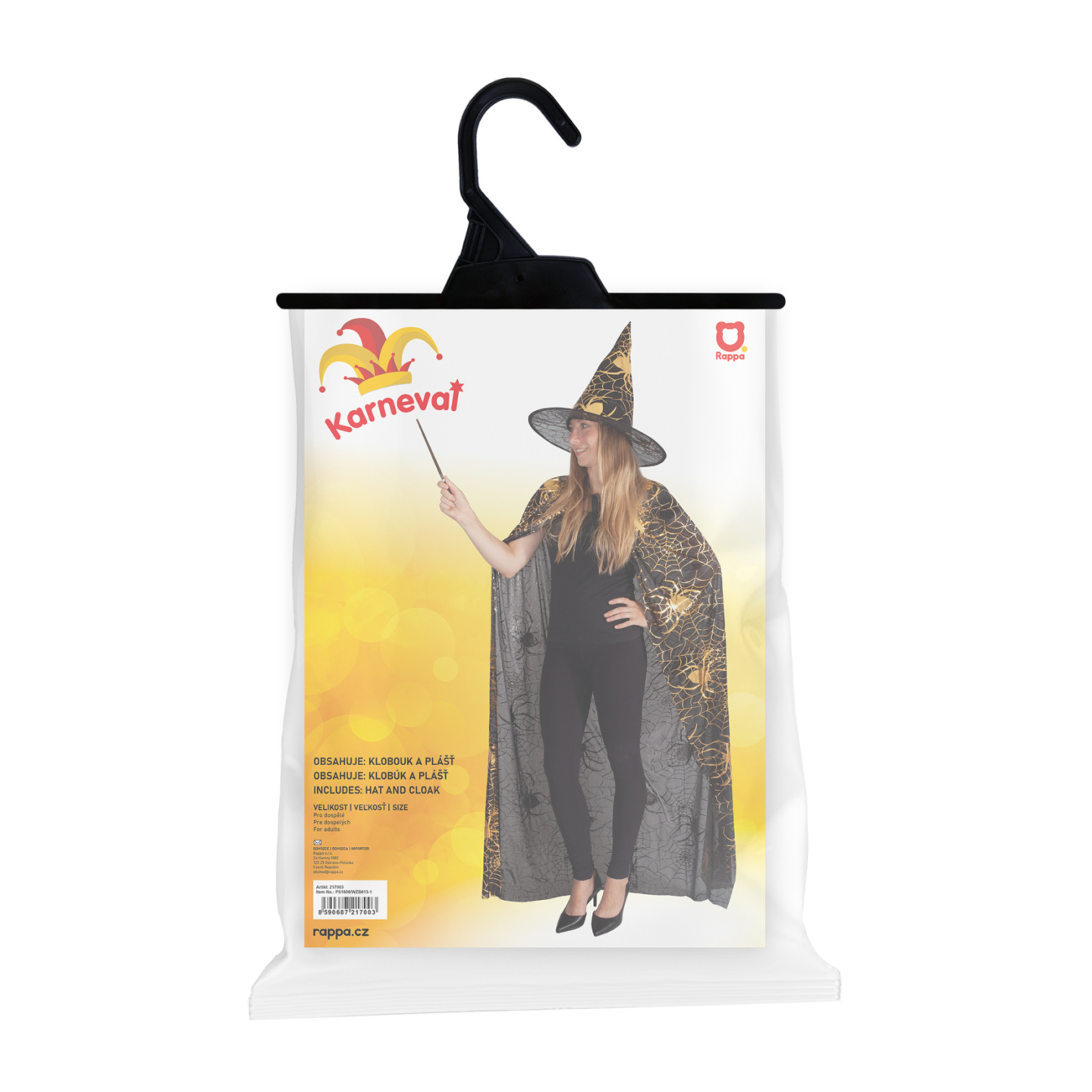 Krásný komplet na karneval nebo Halloween! Souprava zahrnuje černý plášť, který je dekorován halloweenskými motivy zlaté barvy a perfektně sladěný klobouk. Senzace! Doporučeno pro dospělé. Hůlka není součástí balení.