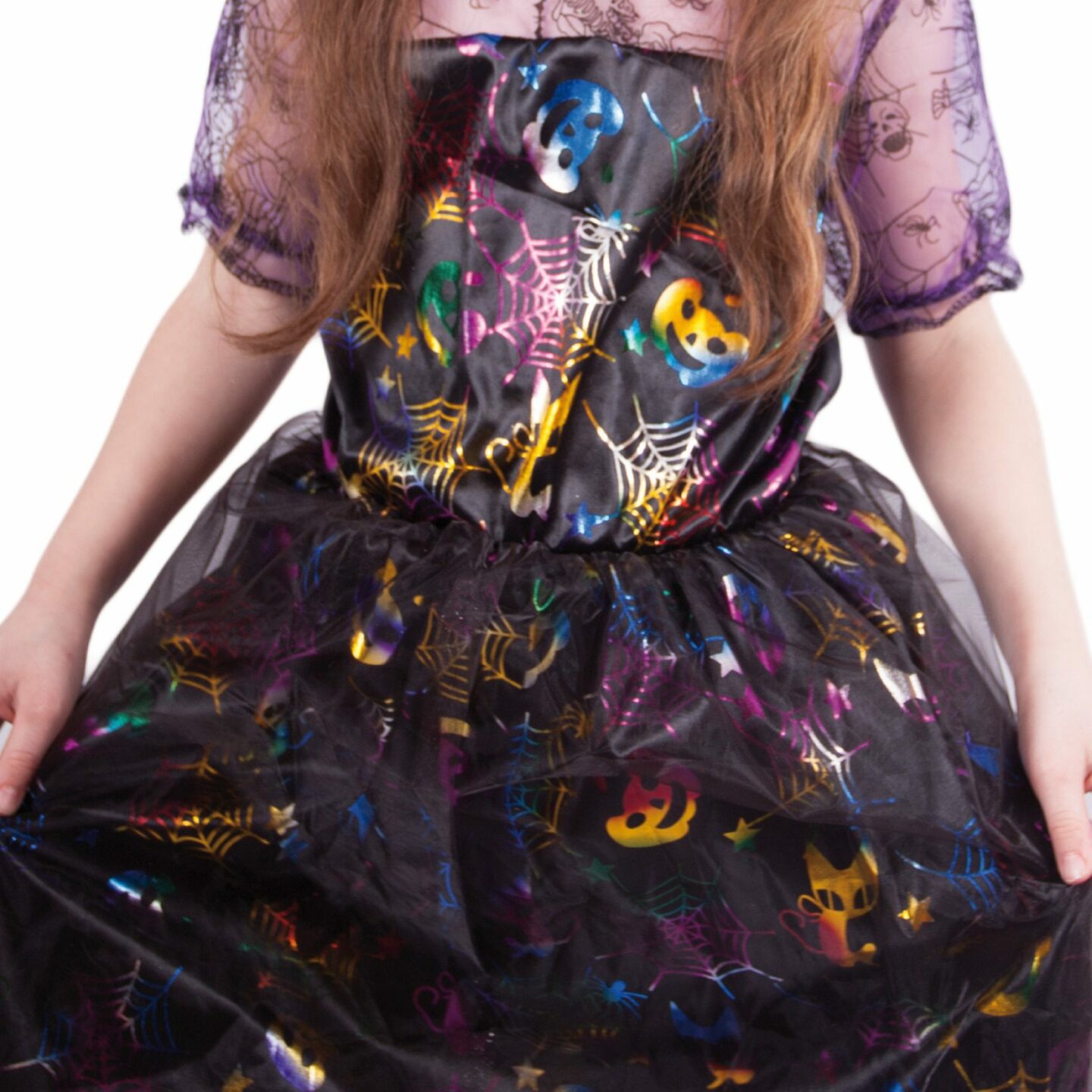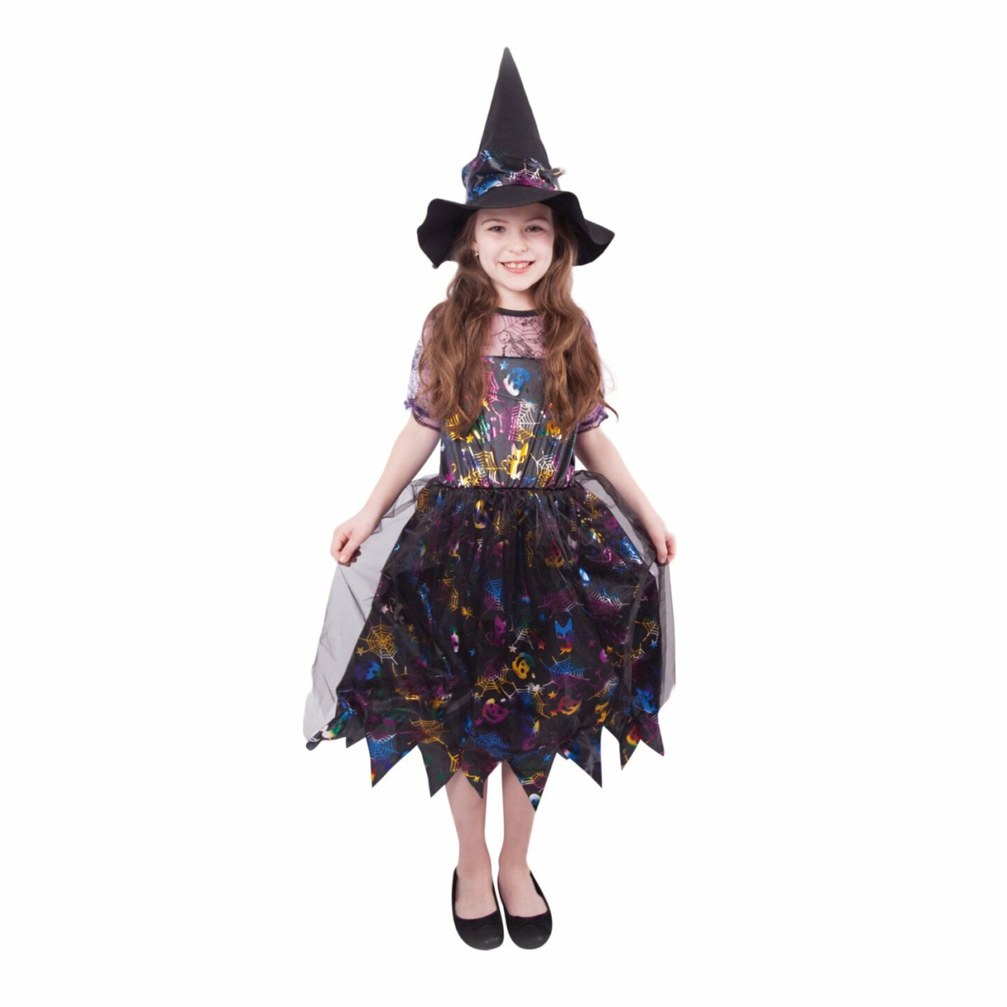 Karnevalový kostým pro malé čarodějnice! Kostým černo-fialové barvy ve velikosti M je určen pro holčičky ve věkovém rozmezí 6-8 let. Šaty jsou dekorovány barevnými halloweenskými motivy. Součástí kostýmu je perfektně sladěný čarodějnický klobouk. S tímto úchvatným kostýmem se zaručeně staneš...