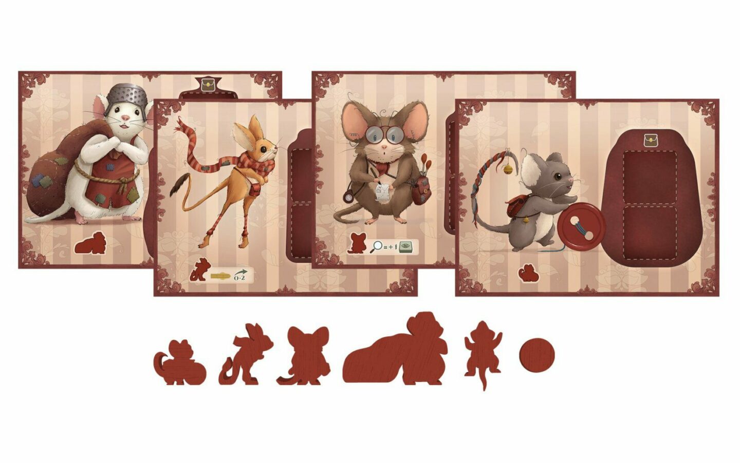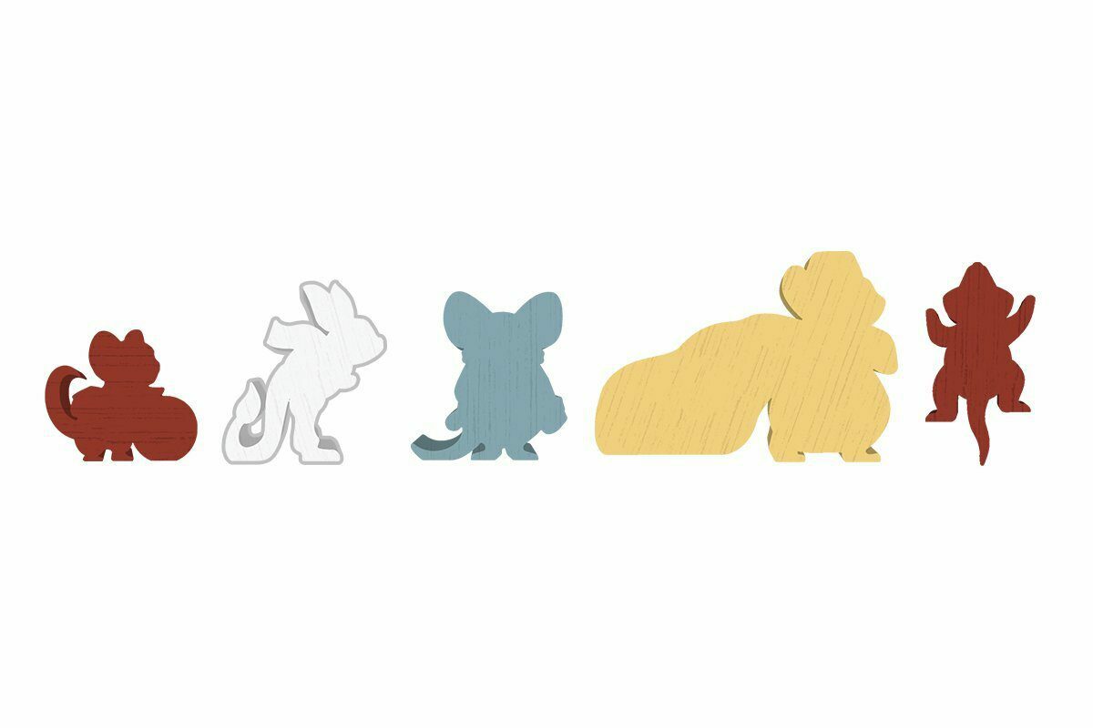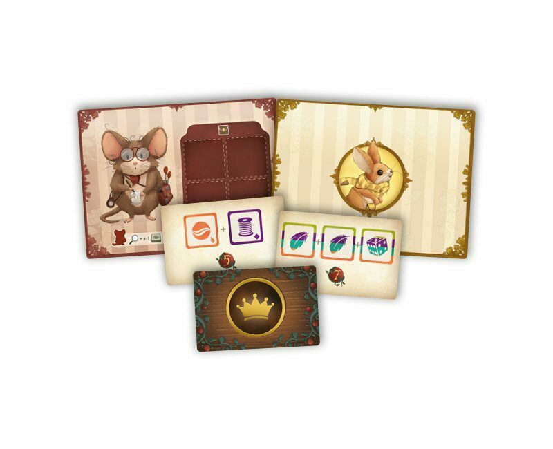 akčních polí 16 karet myšek 20 dřevěných figurek 25 mini karet 1 desetistěnná kostka 18 žetonů a ukazatelů 2 referenční destičky pravidla hry