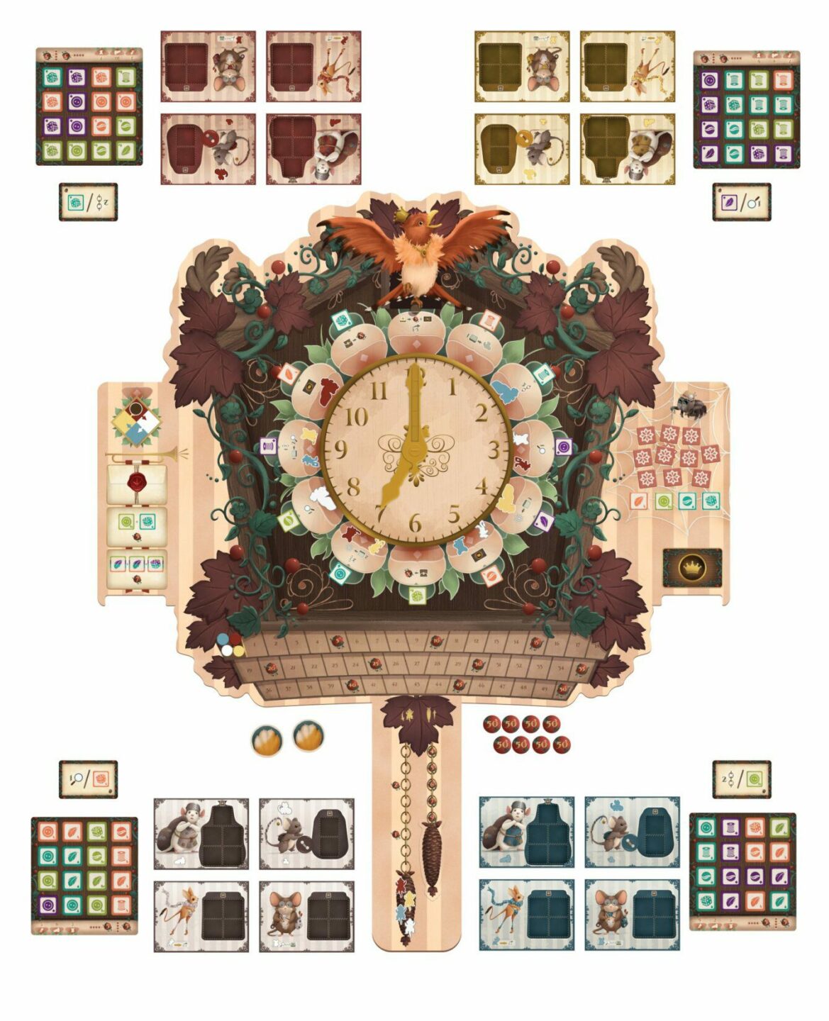 Lady Kukačky. Ale pozor! Minutová ručička není dost velká pro všechny myšky a když začne být těsno, někdo musí z kola ven! Obsah balení: 1 deska hodin 1 sada hodinových ručiček 2 záslepky na ručičky 3 postranní desky 4 desky honby 1 sáček 93 akrylových destiček 12 žetonů
