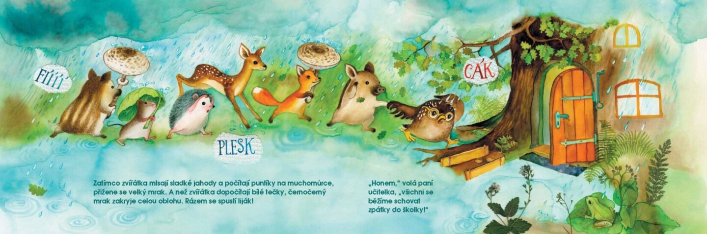 Školku, kterou vede paní učitelka sova, navštěvují malá lesní zvířátka. Jednou, když byli všichni na procházce, přihnal se černý mrak a rázem se spustil prudký liják. Než zvířátka doběhla do školky, byla celá promáčená. Honem se převlékla do pyžamek a kožíšky si dala sušit na šňůru. Když kožíšky...