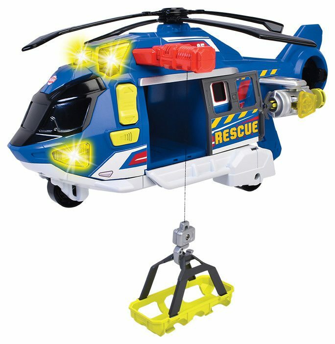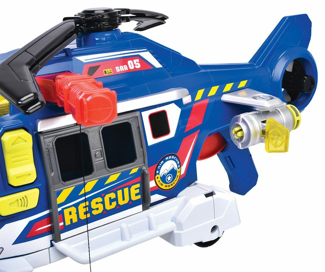 Helikoptéra na volnoběh, světelná a zvuková funkce, mechanický pohyb vrtule, otevírací dveře a pohyblivé části. Součástí je lehátko, které se ovládá tlačítkem (nahoru/dolů). Délka 39 cm.