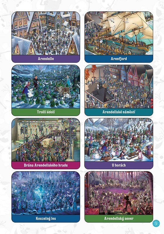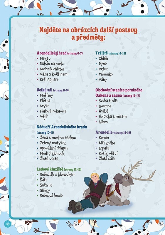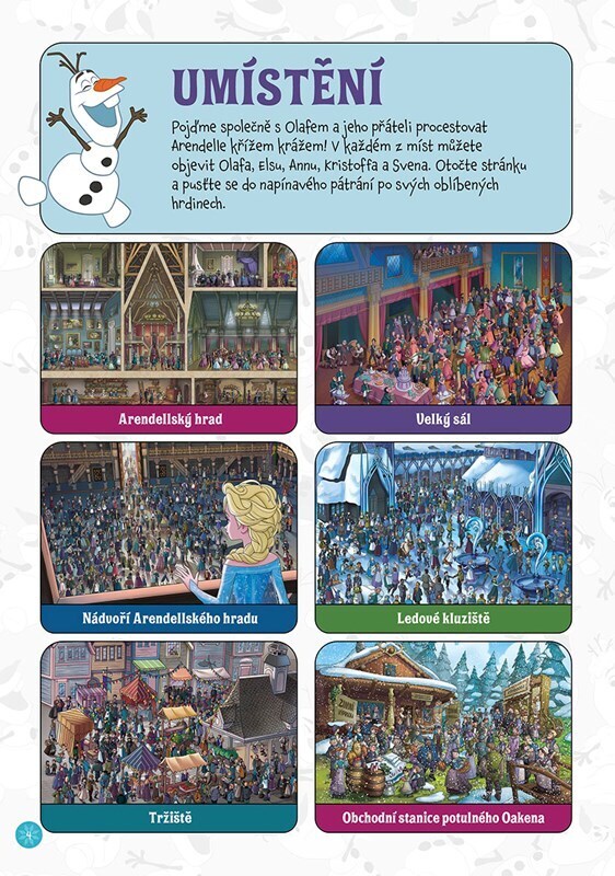 Prozkoumejte překrásná zákoutí Arendelle od královského hradu až po tajuplné Trollí údolí a hledejte při tom na obrázcích Annu, Elsu, Kristoffa, Svena a samozřejmě Olafa! Procvičíte si postřeh, trpělivost a soustředění. Kniha plná skrývaček zaručeně potěší všechny zvídavé milovníky Ledového...