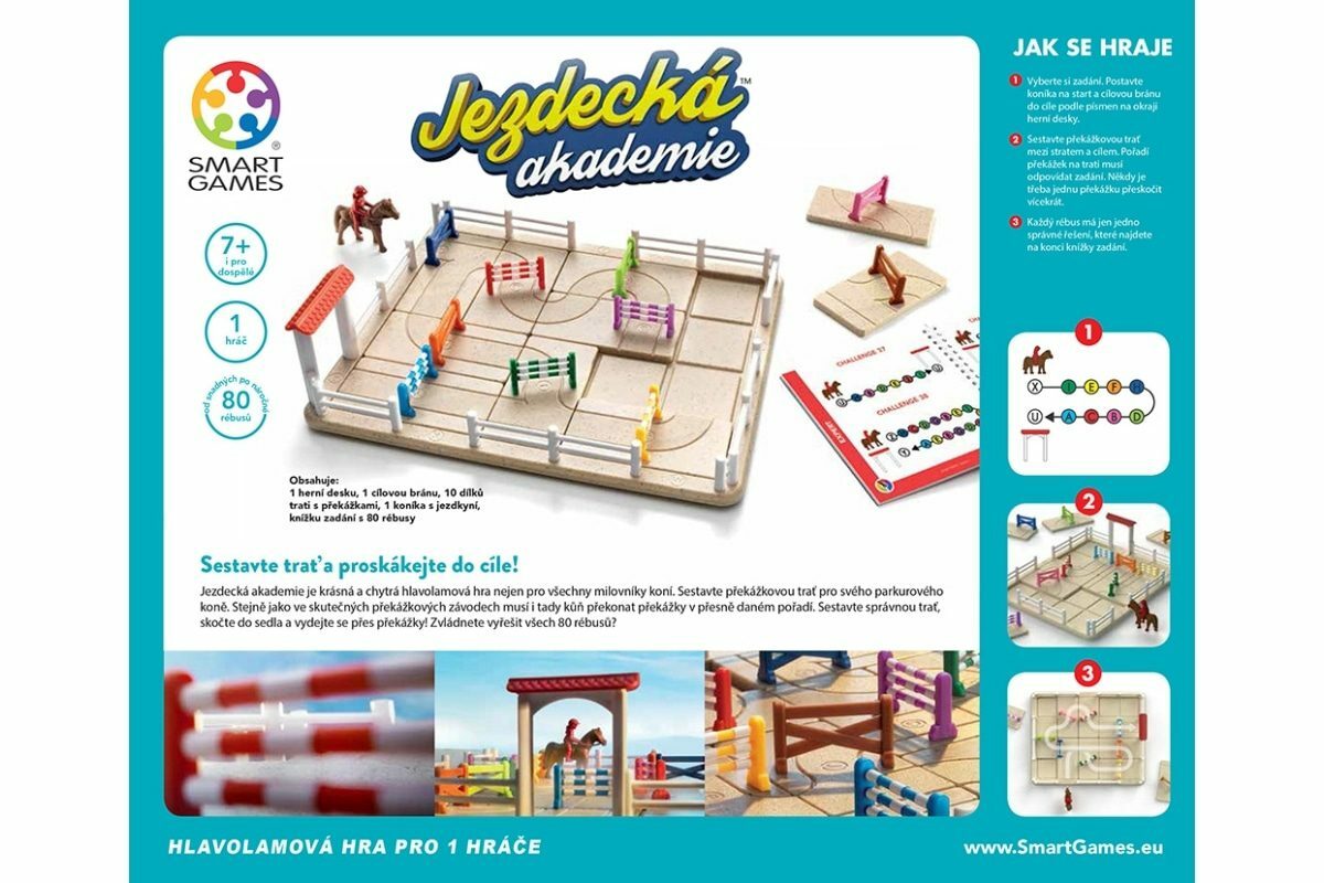 Sestavte trať a proskákejte do cíle! Jezdecká akademie je krásná a chytrá hlavolamová hra nejen pro všechny milovníky koní. Sestavte překážkovou trať pro svého parkurového koně. Stejně jako ve skutečných překážkových závodech musí i tady kůň překonat překážky v přesně daném pořadí. Sestavte...