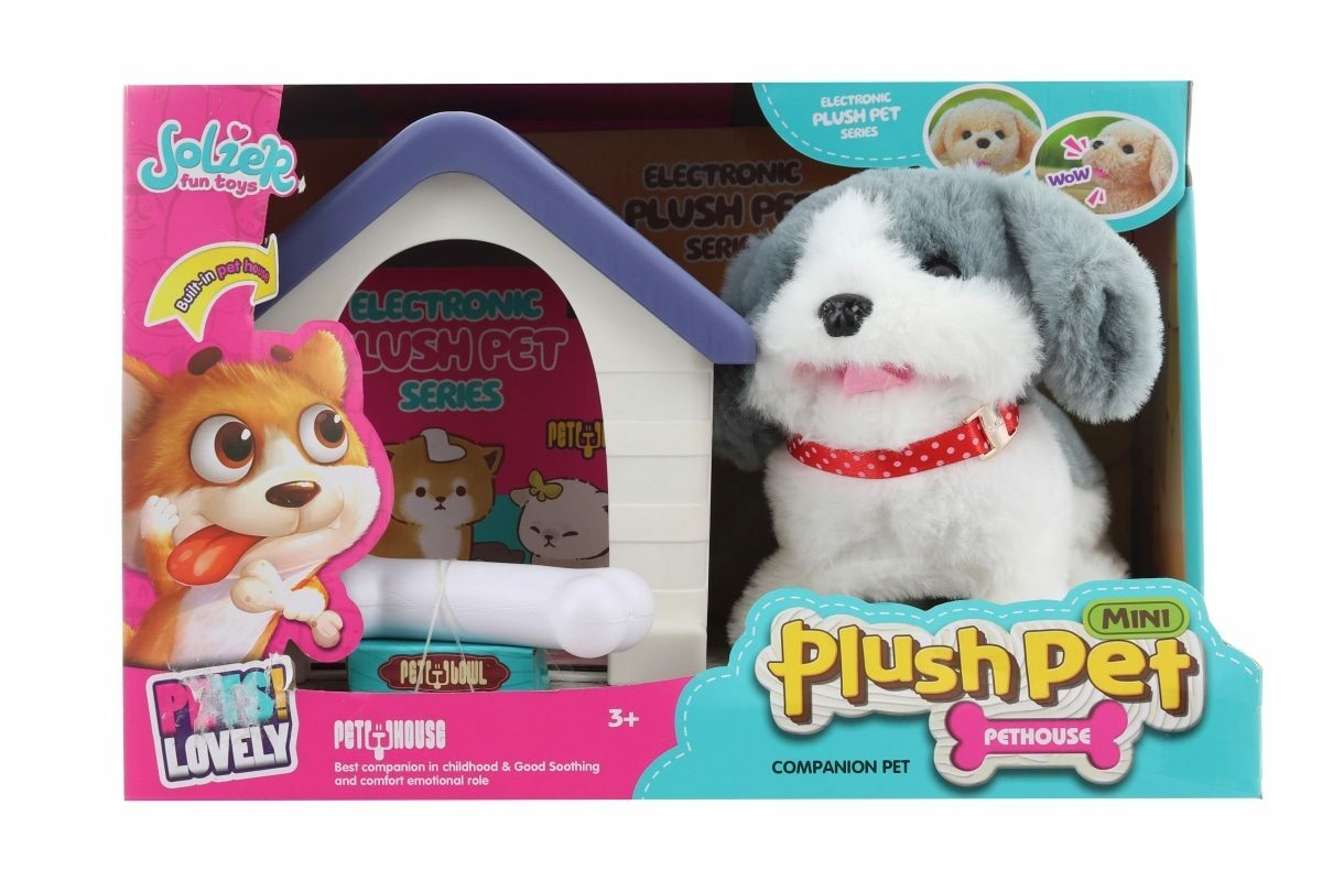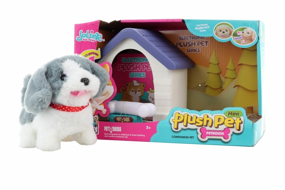 Pejsek s doplňky. Napájení na 2 AA baterie, které nejsou součástí balení. Po zapnutí pejske štěká, chodí a vrtí ocáskem. Balení obsahuje pejska, boudu a kostičku. Materiál plast+plyš. Baleno v krabici. Rozměry balení cca 29x19x17 cm. Velikost pejska 17x15 cm. Věk 3+