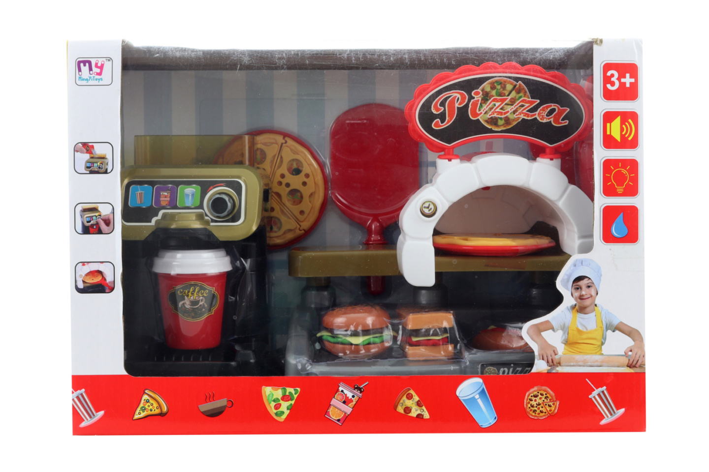 Sada pizzerie a kávovaru. Pizzerie je na AG baterie, které jsou součástí balení. Po zapnutí pizzerie svítí a vydává zvuky vaření. Materiál plast. Baleno v krabici. Rozměry balení 32x22x13 cm. Věk 3+