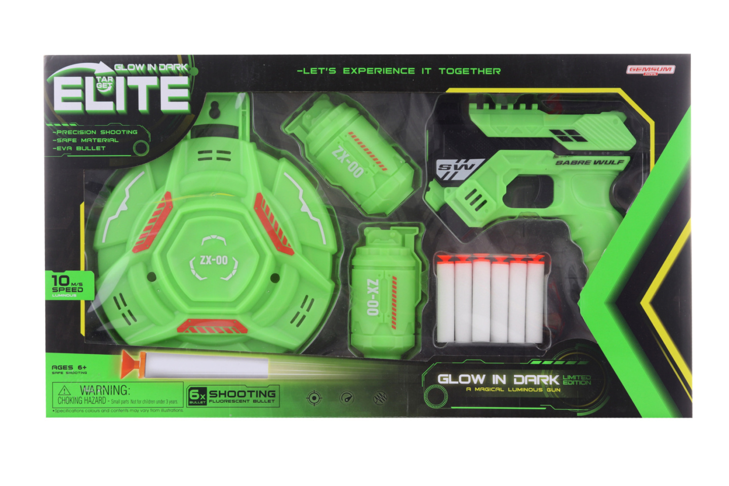 Velká sada pro kluky obsahuje pistol, terč, 2 granáty a 6 pěnových nábojů. Celá sada ve tmě svítí. Baleno v krabici. Rozměry balení cca 47x27x5,5 cm. Věk 6+