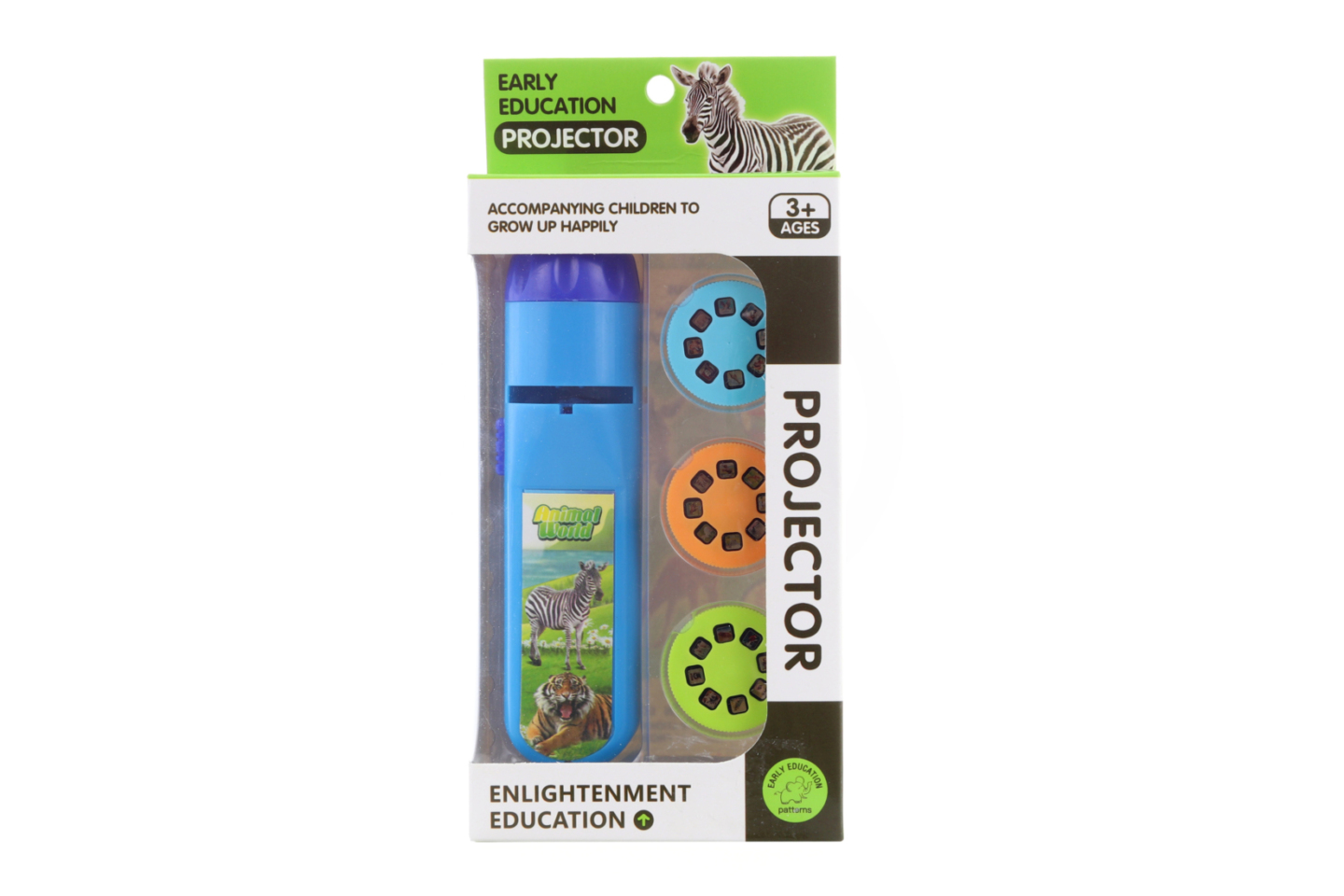 Plastový projektor na baterie. Součástí jsou 3 kotoučky s obrázky (celkem 24 obrázků). Po stisknutí tlačítka projektor promítá obrázky na zeď (nebo jinou bílou plochu). Napájení na 3 AG13 baterie (jsou součástí). Rozměry projektoru cca 13 x 3,5 cm. Rozměry balení cca 9,5x20,5x4 cm. Věk...