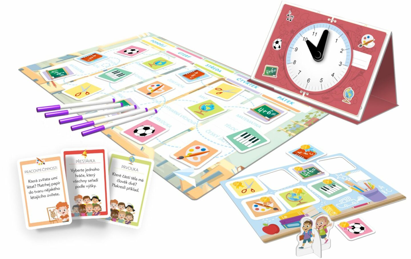 hodiny odbijí třetí. Sem tam si během hry můžete vytáhnout kartu přestávky se zábavnými aktivitami a po skončení vyučování si s ní můžete libovolně hrát. V této kreativní hře jeden hráč v roli učitele čte karty úkolů ostatním. Ostatní hráči jsou žáci, kteří