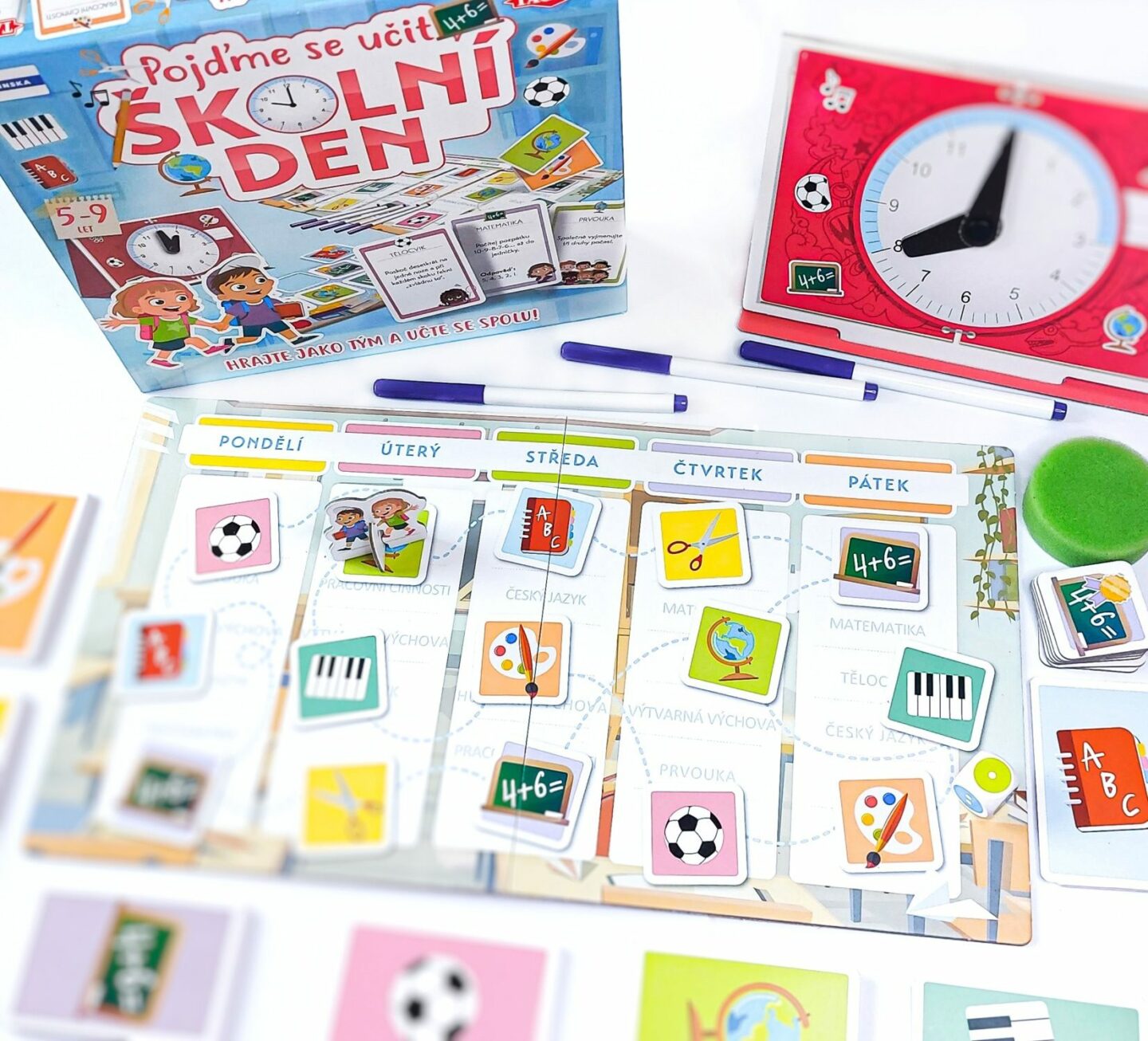 předmětů kartonová figurka 100 karet 1 papírové hodiny, 5 popisovacích tabulek 5 mazatelných fixů houba kostka se samolepkami pravidla