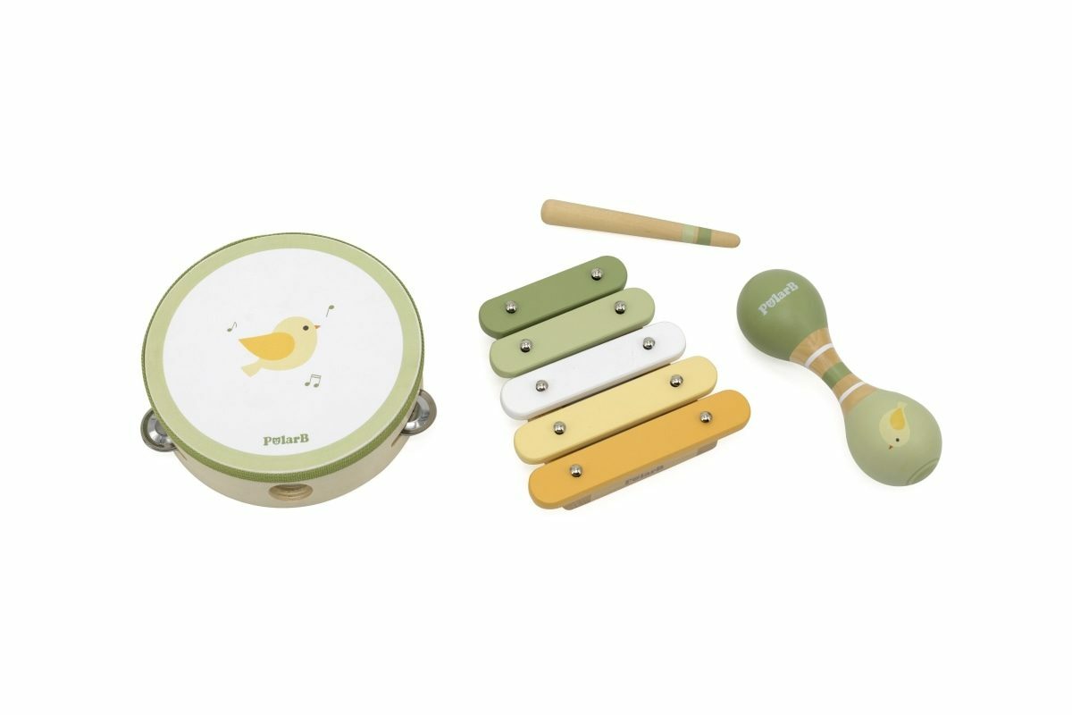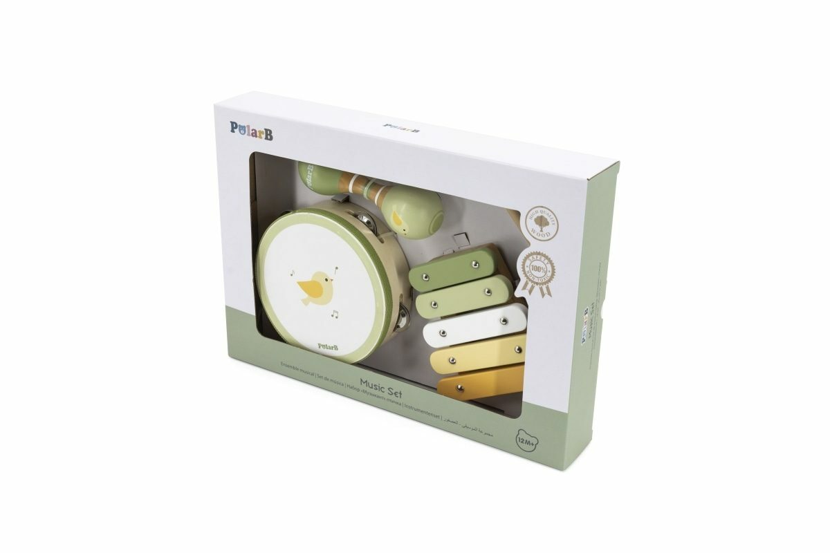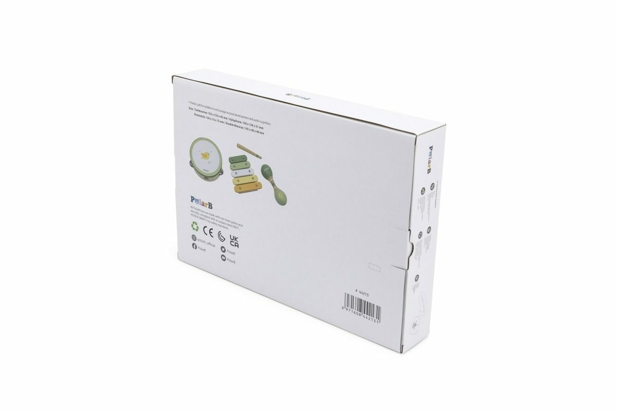 Sada dřevěných hudebních nástrojů. Balení obsahuje rumbakouli, xylofon s paličkou a bubínek. Rozměry balení cca 36x25x6 cm. Věk 12m+