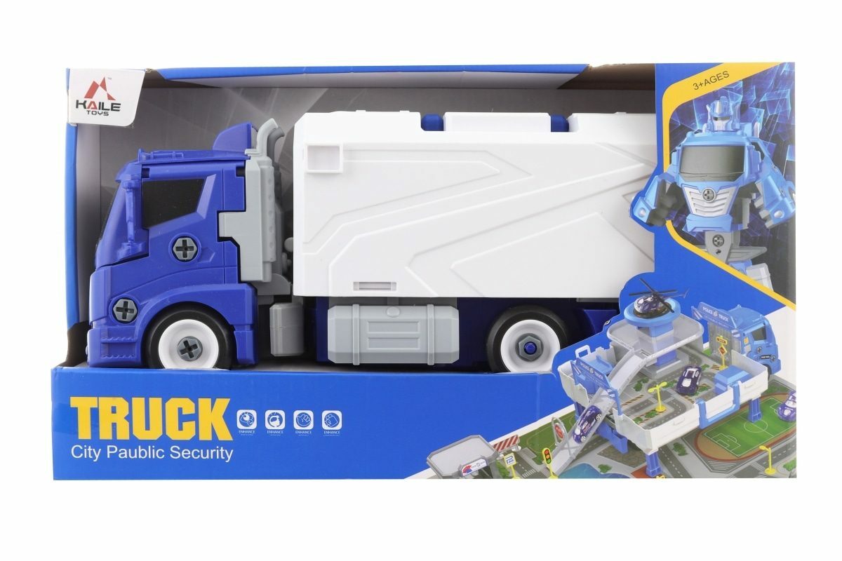 Krásný velký šroubovací kamion, ze kterého lze složit policejní stanice nebo robot. Materiál plast. Baleno v otevřené krabici. Rozměry balení cca 37x22x13 cm. Velikost kamionu 32 cm.