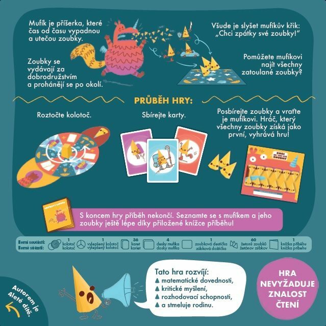 mufíkovi. Hráč, který všechny zoubky získá jako první, vyhrává hru! S koncem hry příběh nekončí. Seznamte se s mufíkem a jeho zoubky ještě lépe díky přiložené knížce příběhu! Tato hra rozvíjí: matematické dovednosti, kritické myšlení, rozhodovací schopnosti.