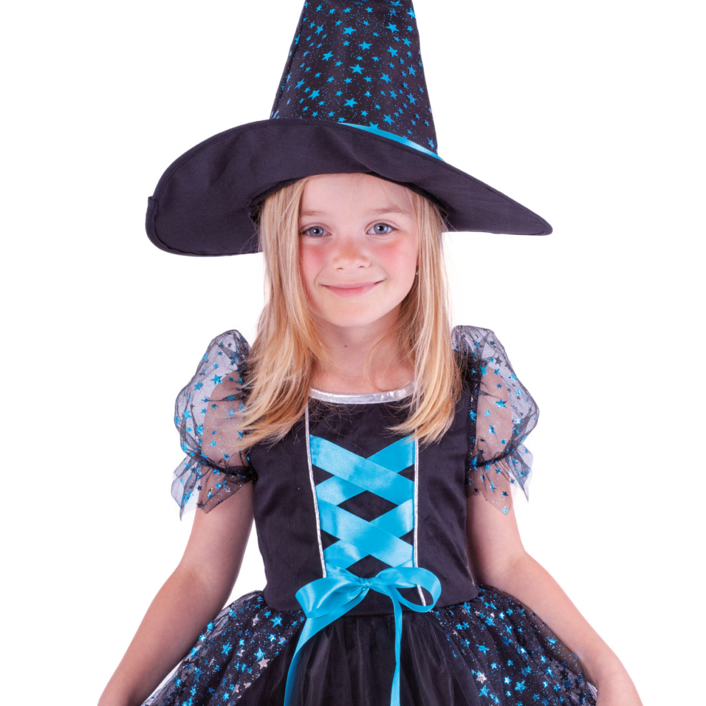 Parádní karnevalový kostým s motivem čarodějnice! Kostým modro-černé barvy ve velikosti S je určen pro holčičky ve věkovém rozmezí 4-6 let (105-116 cm). Šaty jsou zdobené tyrkysově modrou stuhou a metalickými hvězdičkami. Součástí balení je perfektně sladěný klobouk, který je rovněž zdoben...