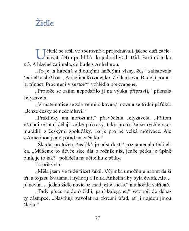 Dvanáctiletá Anhelina uprchla s maminkou před válkou na Ukrajině. S dalšími dětmi uprchlíků se má začlenit do běžné české třídy. Jenže zatímco ostatní děti dělají při výuce češtiny rychlé pokroky, Anhelina se učit nechce. Trápí ji, že o zbytku rodiny nemá žádné zprávy, a nejradši by se hned...