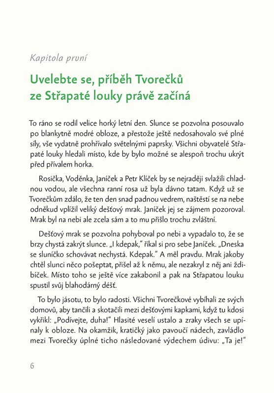 Příběh Slečny Duhy zavede dětské čtenáře mezi Tvorečky, jejichž vesnici najdeme na samém okraji Střapaté louky. Tvorečků zde žije jedenáct a každý z nich je něčím jedinečný. Jedno však mají přece jen společné – dobré a laskavé srdce, díky kterému se zatoulaná duhová dívenka může cítit v jejich...