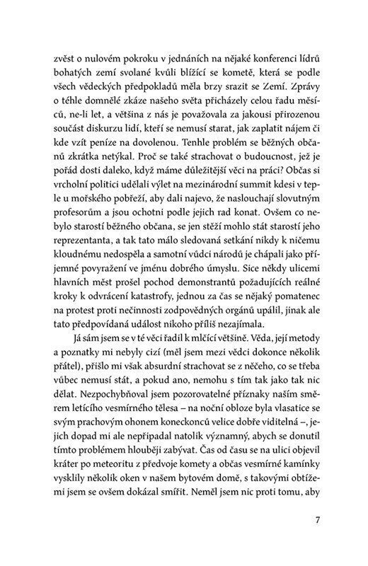 Filozofická novela zasazená do prostředí alternativního politického zřízení, které vyžaduje od občanů zapojení do činností užitečných pro společnost. O míře užitku rozhodují úředníci a kniha sleduje běžný den právě jednoho z nich. Mezitím se k Zemi blíží kometa… Dílo provokuje k vlastním úvahám...