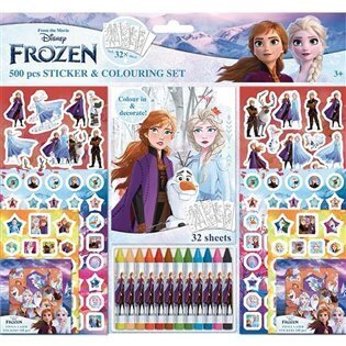 Set obsahuje téměř 500 různých druhů samolepek, blok (32 listů) ke psaní i malování a 12 voskovek....