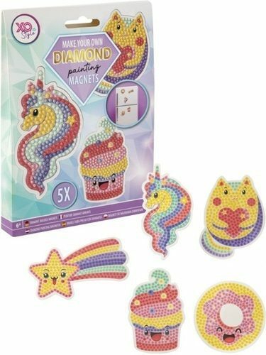 Vytvoř si vlastní diamantovou magnetku. Sada obsahuje: 5ks magnetek, barevné diamanty, 1 pero na aplikaci, 1 kalíšek na vysypání, 1 vosk Návod: Odstraň ochrannou folii z magnetky. Jednotlivé diamanty přenášej pomocí pera na lepivá místa na obrázku a perem přimáčkni.