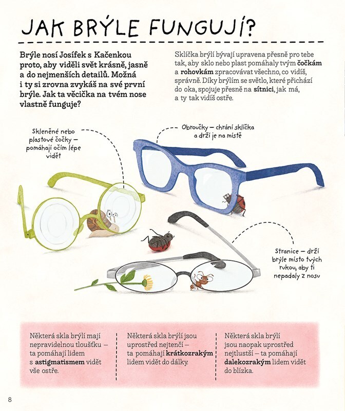 Kačenka a Josífek nosí brýle, díky kterým vidí svět ostře a do nejmenších detailů. Možná si i ty zrovna zvykáš na své první brýle a zatím nevíš, co si o nich myslet. Budou opravdu tak užitečné, jak tvrdí dospělí? Přestanou ti někdy na nose překážet? Neboj, teprve s brýlemi začíná pořádné...