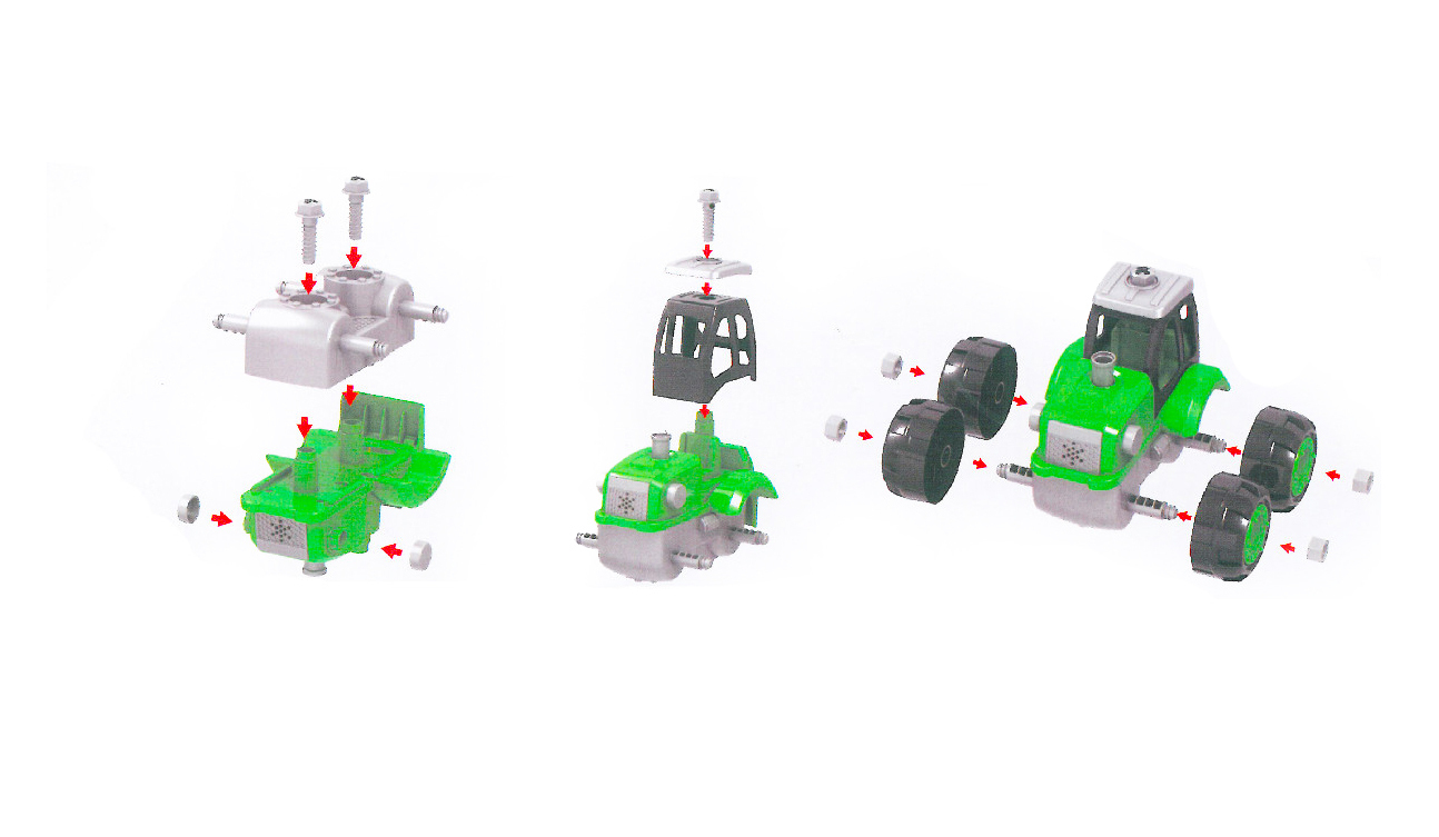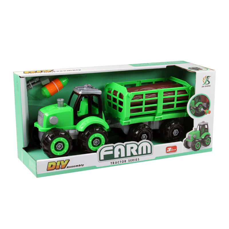 Zelený šroubovací traktor s vlečkou na dřevo. Pomocí šroubováku, který najdeš v balení, můžeš traktor snadno rozložit a sestavit si ho znovu. Velikost traktoru s vlečkou je 32 cm.