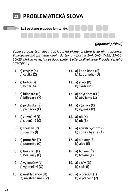 Pravopisná cvičení nepatří mezi oblíbené školní činnosti, ale co naplat. Co se poctivou přípravou naučíš, u přijímaček nebo školních testů jako když najdeš! Aby procvičování bylo co nejpříjemnější, rozhodli jsme se mluvnické úlohy doplnit o křížovky či doplňovačky, po jejichž vyřešení na tebe...