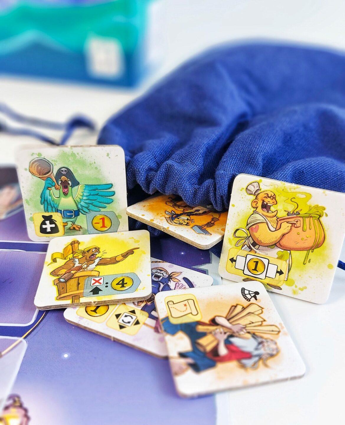 pytlíku! 3) Uvážlivě ji umístěte na svou desku dobrodružství. Každá postava má nějaký speciální efekt, který se vyhodnocuje buď po umístění, nebo na konci hry. Jakmile některý z hráčů zaplní čtyři sloupce na své desce dobrodružství, nastává konec hry. Obsahuje 4