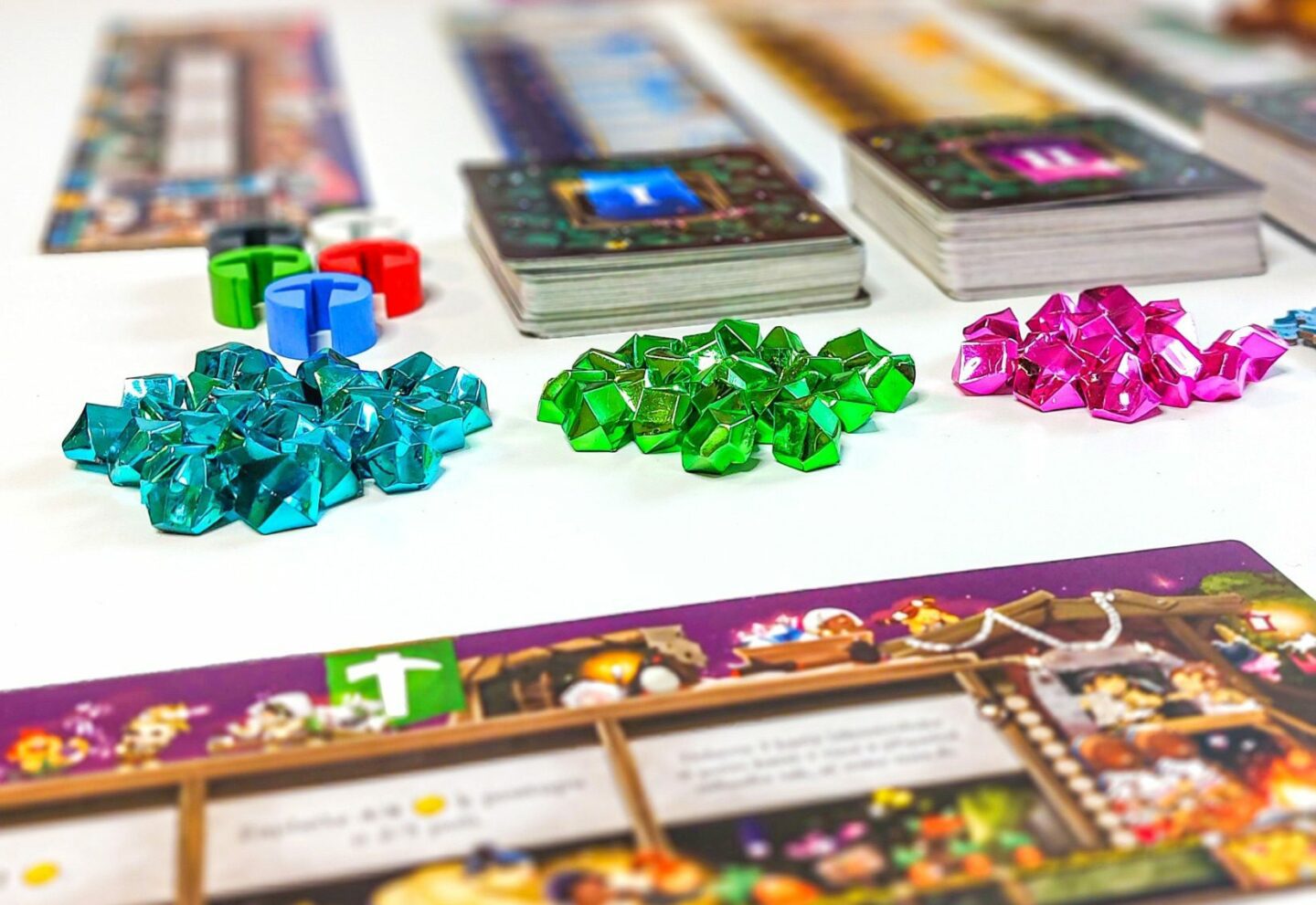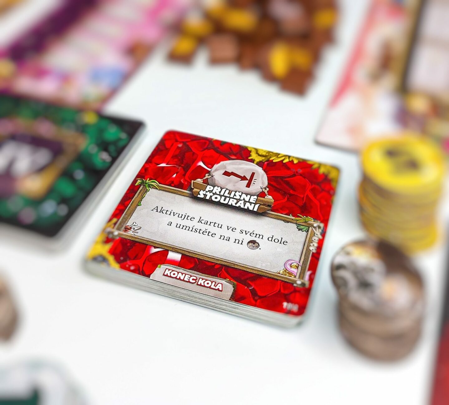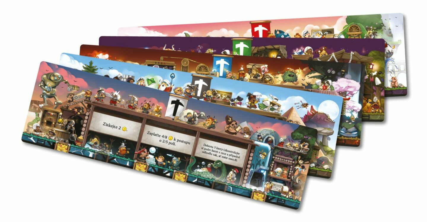 vítěznými body! Obsah balení: 136 karet dolů 18 karet událostí 5 desek povrchu, 3 oboustranné desky pokroku 5 ukazatelů pokroku 60 žetonů mincí 60 žetonů vítězných bodů 44 žetonů strojů 24 žetonů závalu 40 dřevěných figurek vozíků 1 pravidla