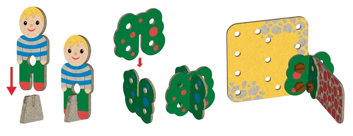 přidali postavičkám i herní prostředí – domečky, ploty, stromy... Hračka je jednoduchá a přímočará. Děti tak mají více prostoru pro kreativitu a nejsou zahlceny zbytečnými detaily nebo přehnanou barevností. Stavebnice cílí na zlepšení jemné motoriky a technické dovednosti