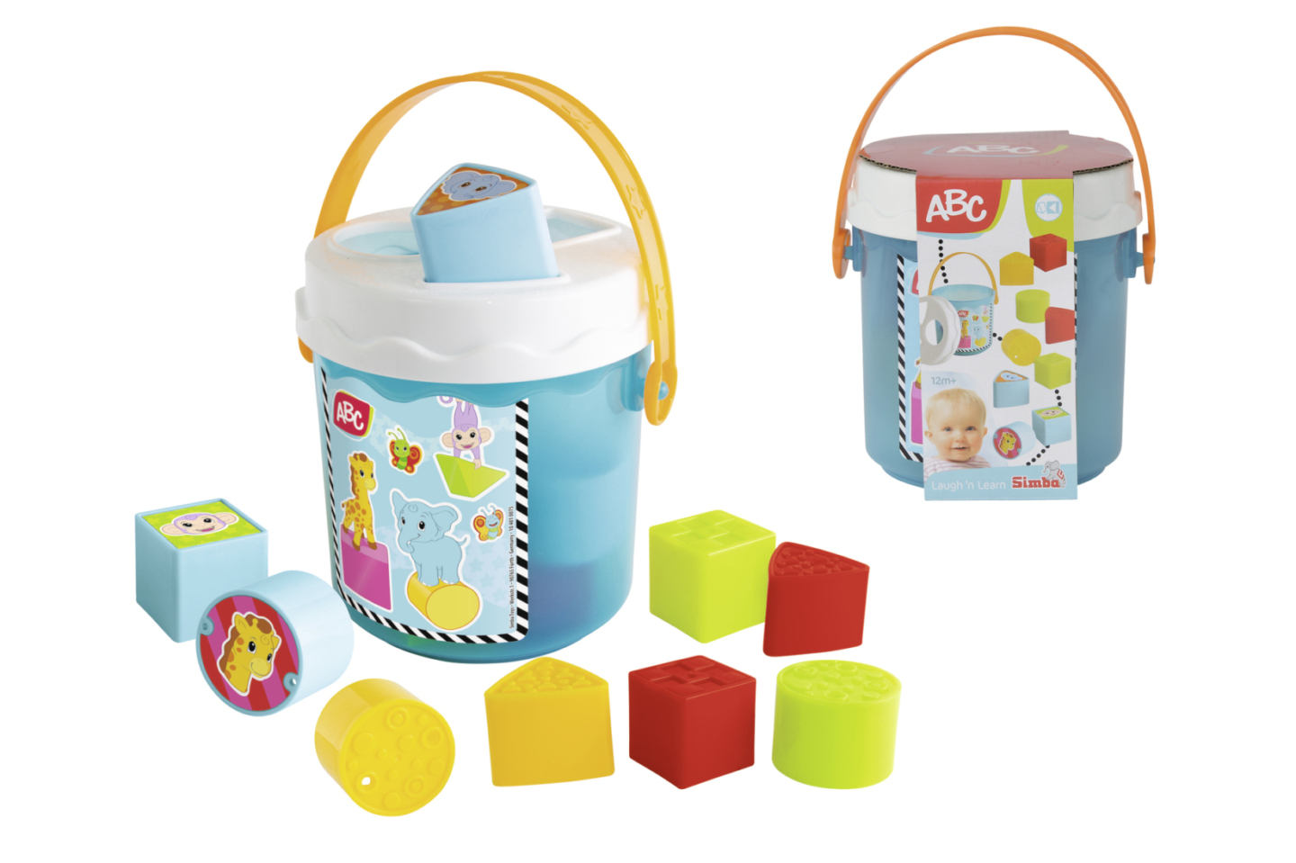 Barevné kostky v kyblíku s víkem se třemi různými otvory pro vkládání dle tvaru, 11 ks, velikost kyblíku 15 cm.