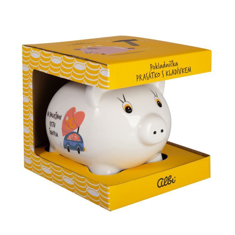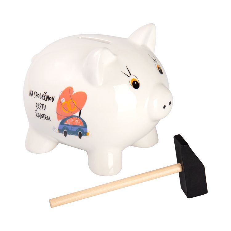 Klasické pokladničky ve tvaru prasátka s milým věnováním potěší všechny šetřílky. Součástí balení je i kladívko, které vás k vytoužené částce nakonec dostane. Materiál: Porcelán Rozměry: 14 cm × 15 cm × 16 cm