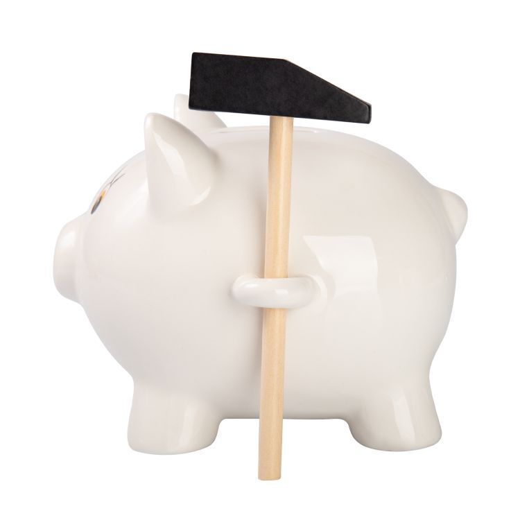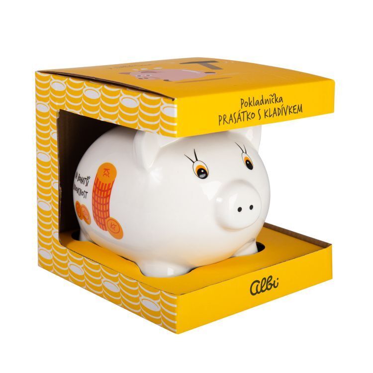 Klasické pokladničky ve tvaru prasátka s milým věnováním potěší všechny šetřílky. Součástí balení je i kladívko, které vás k vytoužené částce nakonec dostane. Materiál: Porcelán Rozměry: 14 cm × 15 cm × 16 cm