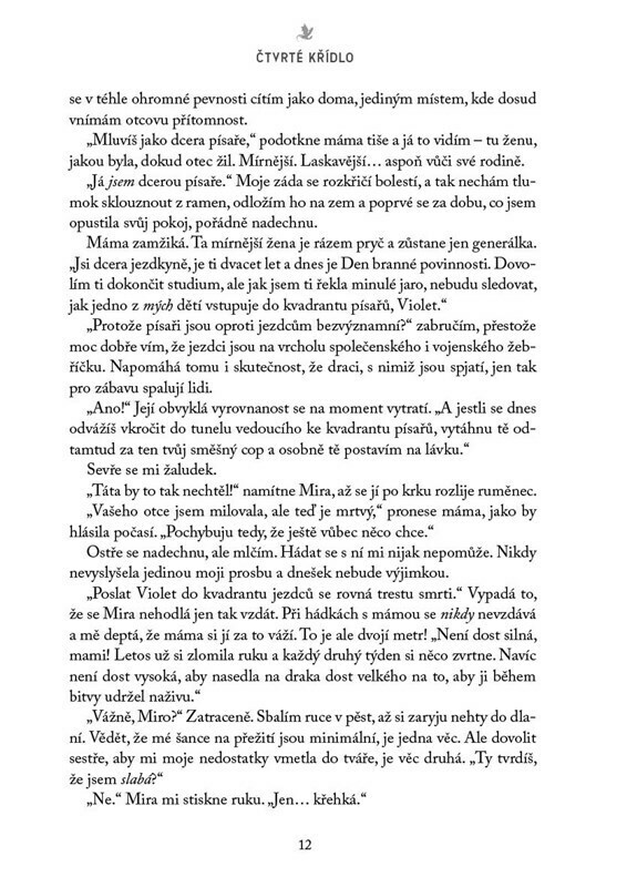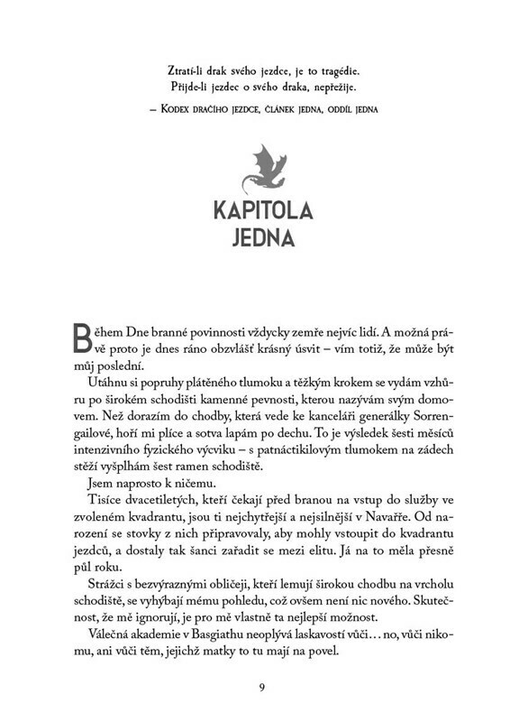 Dvacetiletá Violet Sorrengailová měla nastoupit do kvadrantu písařů a strávit život mezi knihami. Její matka, nesmlouvavá velící generálka, jí však nařídí, aby se připojila ke stovkám kandidátů toužících dostat se mezi navarrskou elitu: dračí jezdce. Violet chybí trénink, navíc je menší než...