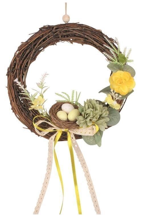 Věnec s dekoracemi a hnízdem 20 cm, žlutá stuha...