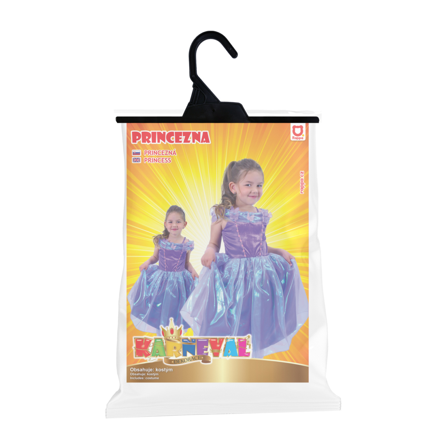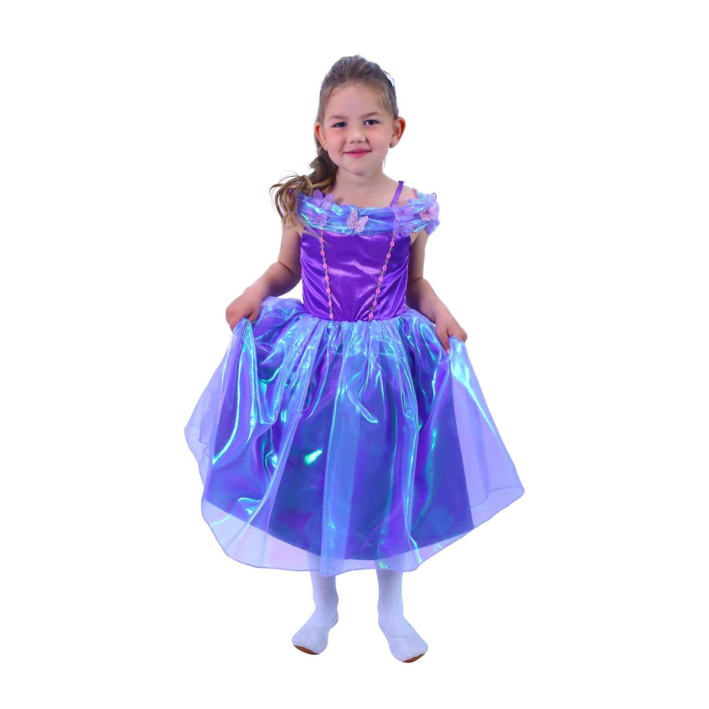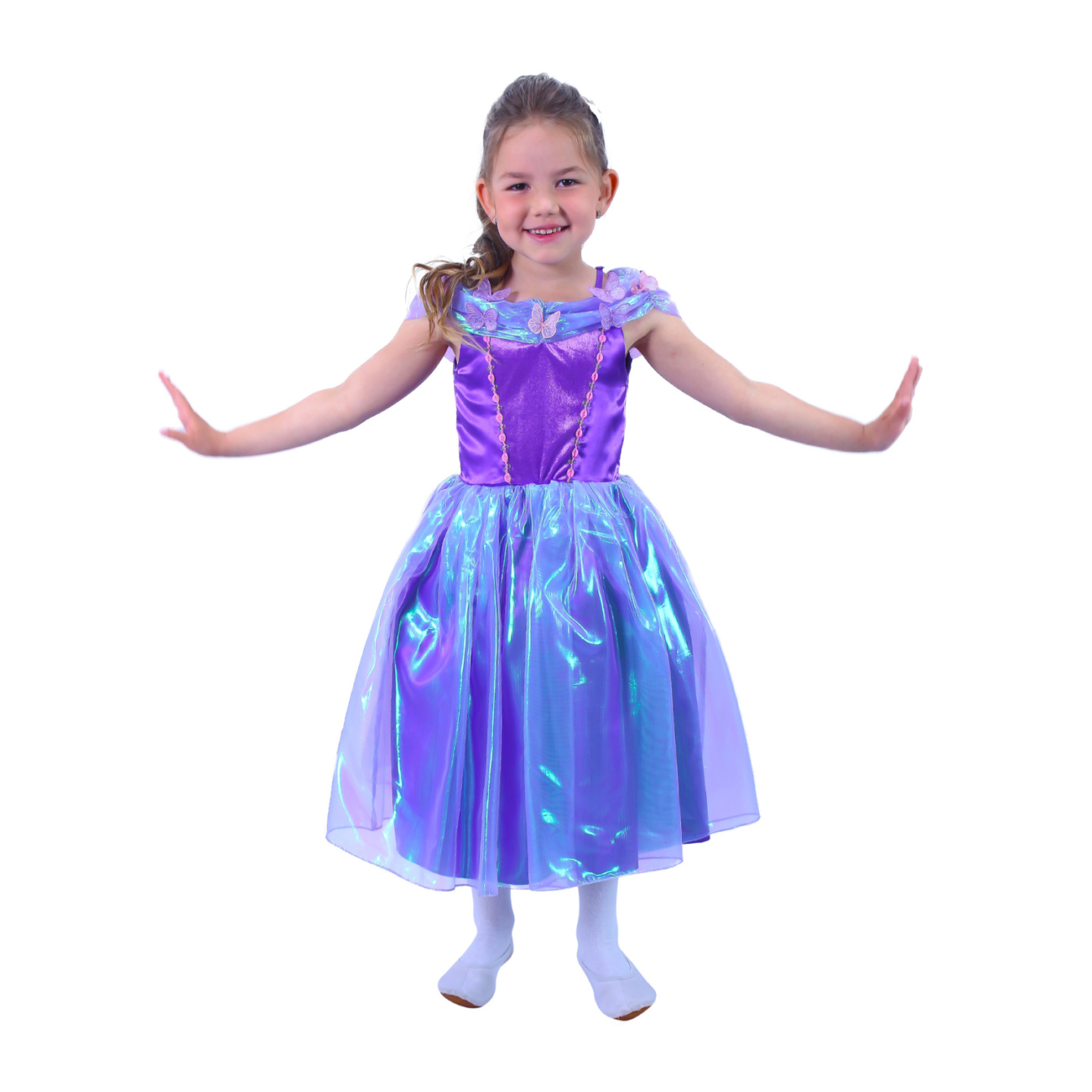 Okouzlující karnevalový kostým s motivem princezny ve fialové barvě, horní část je zdobena stylovými motýlky. Kostým je ve velikosti M a je určen pro holčičky ve věkovém rozmezí 6-8 let (117-128 cm).