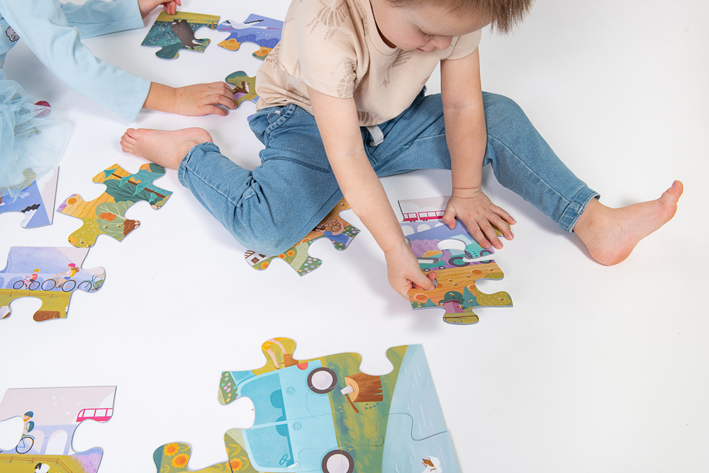 dobře odolávají hrubší motorice malých dětí. Umožněte jim zažít radost, když se jim podaří najít a spojit první dva dílky. Podporujte vytrvalost a prostorovou představivost dítěte.